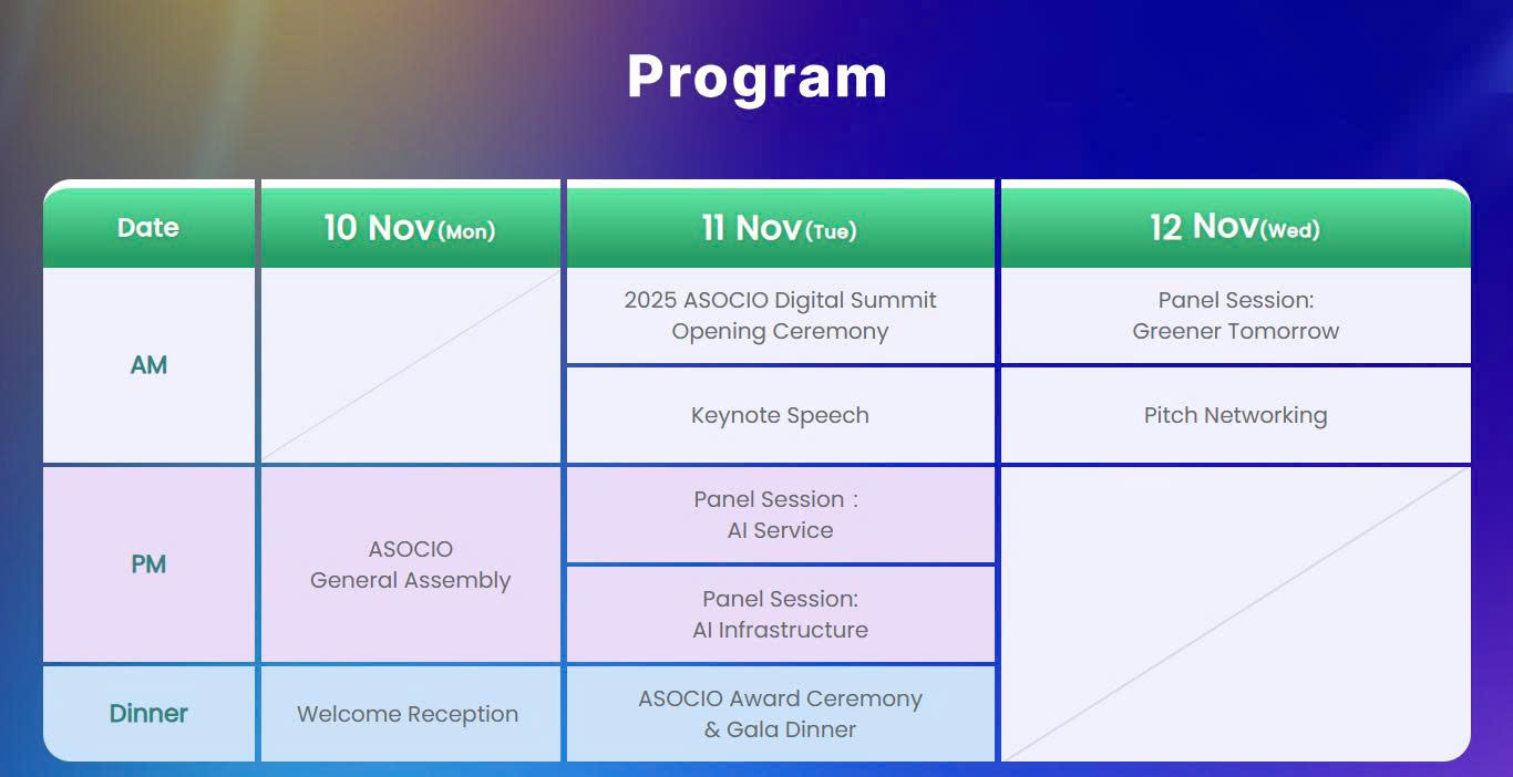 ASOCIO Digital Summit 2025 với chủ đề “AI Shaping Digital Asia”, tập trung vào vai trò của trí tuệ nhân tạo trong chuyển đổi số, phát triển nguồn nhân lực số, chính phủ thông minh, điện toán đám mây và kinh tế số khu vực. Đây là cơ hội đặc biệt để cập nhật xu hướng công nghệ, mở rộng hợp tác quốc tế và kết nối với hệ sinh thái đổi mới sáng tạo toàn cầu.
