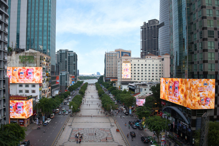 Quảng cáo đồng bộ 4 màn LED của Goldsun Media trên Phố đi bộ Nguyễn Huệ, TP. HCM